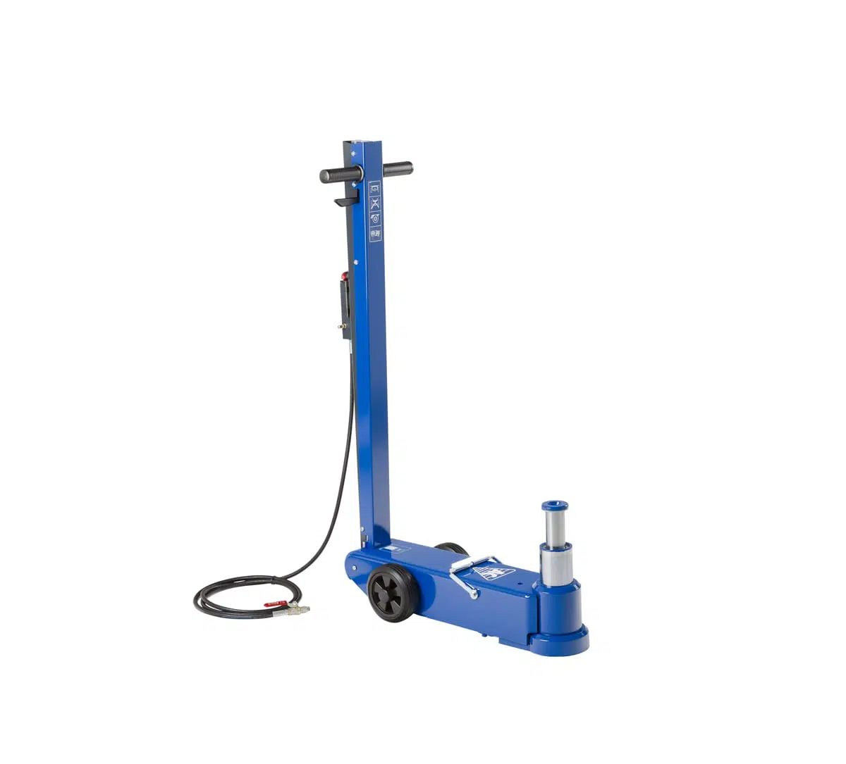 Tjakkurinn virkar bæði á þrýstilofti eða þá á köfnunarefni úr dekkjum vélarinnar eða á sér kút.