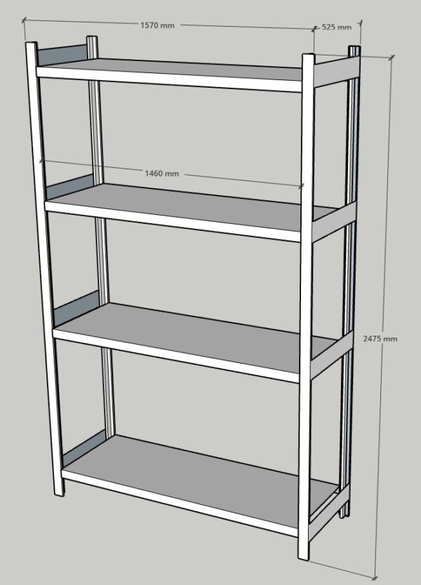 Þessi eining er 2475x1570x525 mm (HxBxD) með fimm hillum